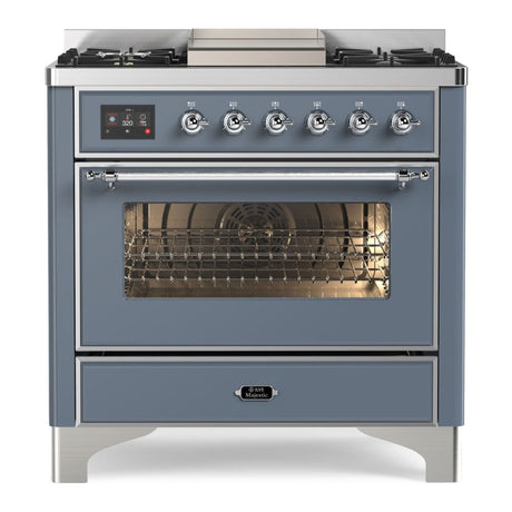 ILVE Majestic II 36" Dual Fuel Range 6 Sealed Burners, Triple Glass Door, Blue Grey, Chrome Knobs-LP