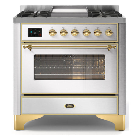 ILVE Majestic II 36" Dual Fuel Range 6 Sealed Burners, Triple Glass Door, White, Brass Knobs-LP