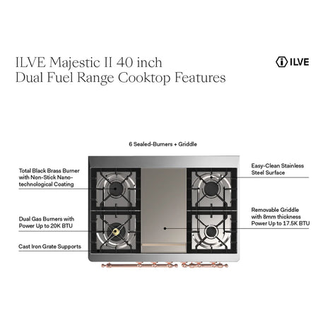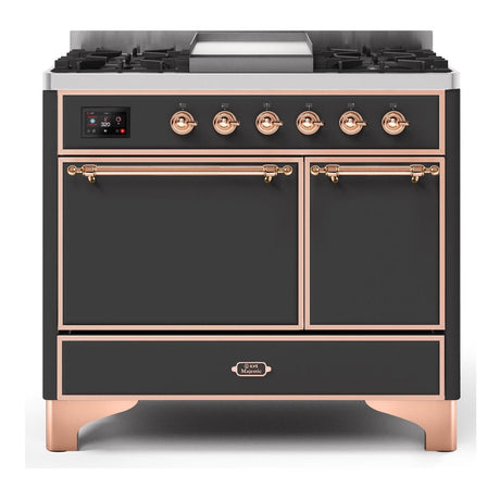 ILVE Majestic II 40" Dual Fuel Range 6 Sealed Burners, Solid Door, Graphite Matte, Copper Knobs-LP