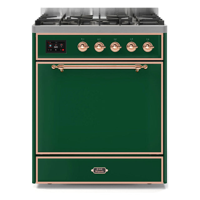 ILVE Majestic II 30” Dual Fuel Range 5 Sealed Burners, Solid Door, Emerald Green, Copper Knobs-LP