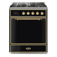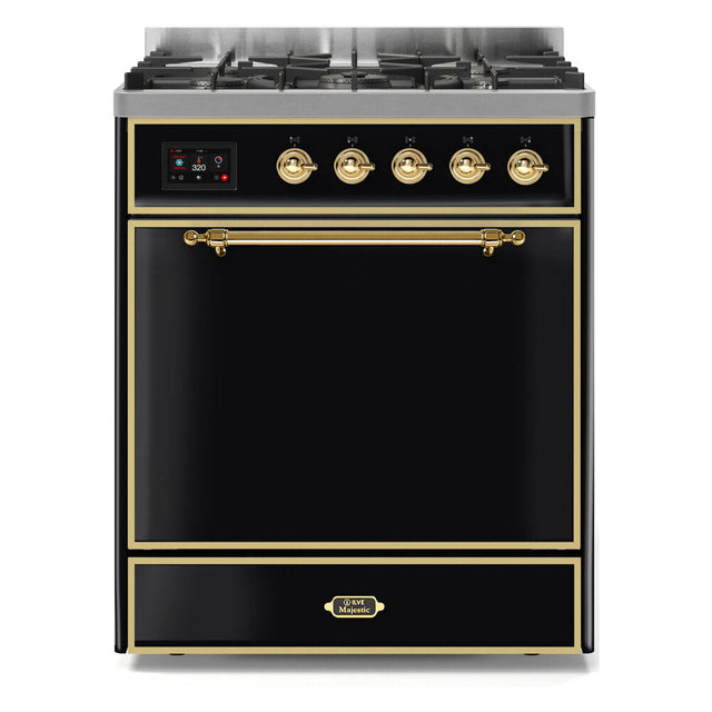 ILVE Majestic II 30” Dual Fuel Range 5 Sealed Burners, Solid Door, Glossy Black, Brass Knobs-LP