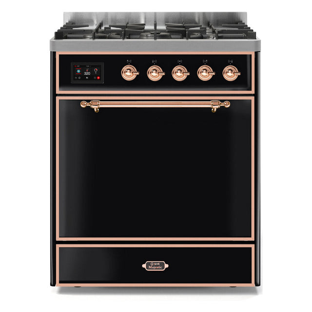 ILVE Majestic II 30" Dual Fuel Range 5 Sealed Burners, Solid Door, Glossy Black, Copper Knobs-Natural Gas