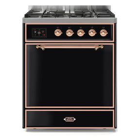 ILVE Majestic II 30” Dual Fuel Range 5 Sealed Burners, Solid Door, Glossy Black, Copper Knobs-LP