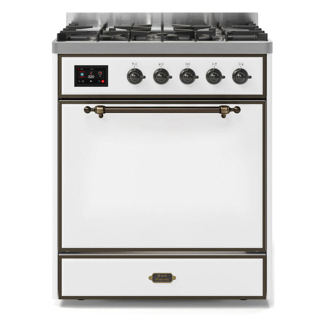 ILVE Majestic II 30” Dual Fuel Range 5 Sealed Burners, Solid Door, White, Burnished Knobs-LP