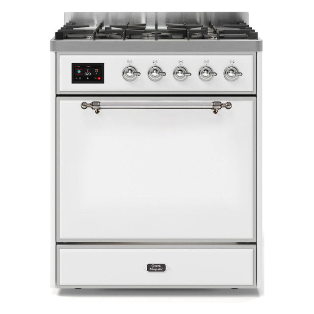 ILVE Majestic II 30” Dual Fuel Range 5 Sealed Burners, Solid Door, White, Chrome Knobs-LP