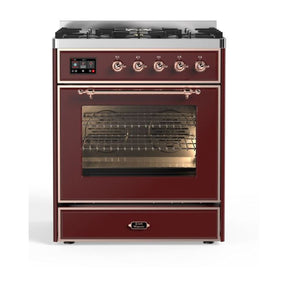 ILVE Majestic II 30” Dual Fuel Range 5 Sealed Burners, Triple Glass Door, Burgundy, Copper Knobs-LP