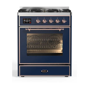 ILVE Majestic II 30” Dual Fuel Range 5 Sealed Burners, Triple Glass Door, Midnight Blue, Copper Knobs-LP