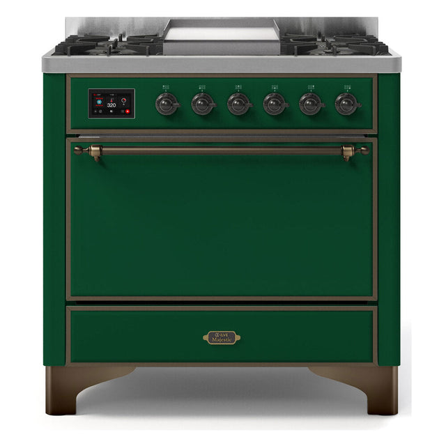 ILVE Majestic II 36" Dual Fuel Range 6 Sealed Burners, Solid Door, Emerald Green, Burnished Knobs-Natural Gas