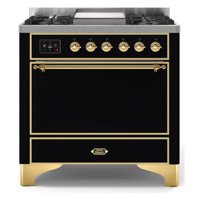 ILVE Majestic II 36" Dual Fuel Range 6 Sealed Burners, Solid Door, Glossy Black, Brass Knobs-Natural Gas