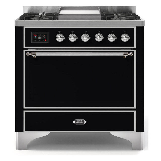 ILVE Majestic II 36" Dual Fuel Range 6 Sealed Burners, Solid Door, Glossy Black, Chrome Knobs-LP