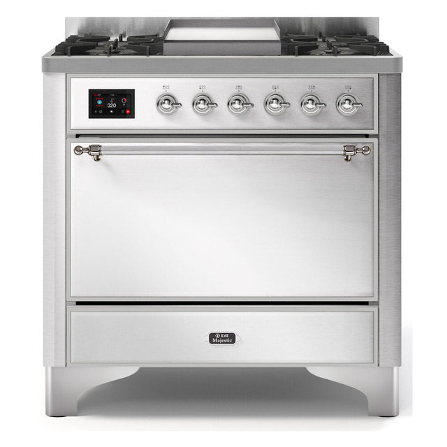 ILVE Majestic II 36" Dual Fuel Range 6 Sealed Burners, Solid Door, Stainless Steel, Chrome Knobs-Natural Gas