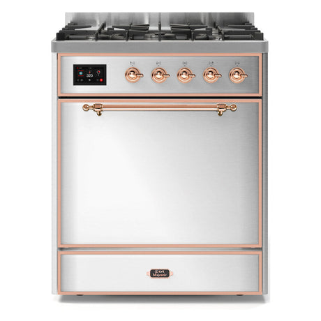 ILVE Majestic II 30” Dual Fuel Range 5 Sealed Burners, Solid Door, Stainless Steel, Copper Knobs-LP