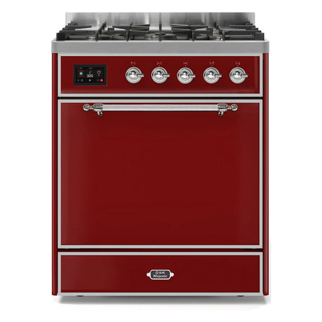 ILVE Majestic II 30” Dual Fuel Range 5 Sealed Burners, Solid Door, Burgundy, Burnished Knobs-LP