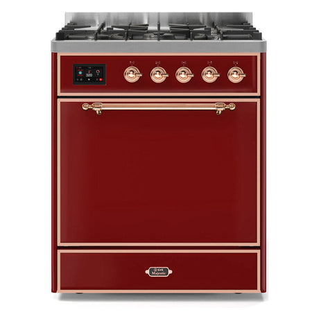 ILVE Majestic II 30” Dual Fuel Range 5 Sealed Burners, Solid Door, Burgundy, Copper Knobs-LP